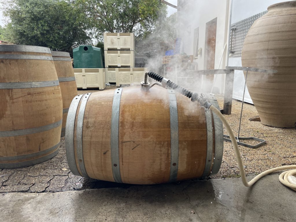 Manchmal werden Holzfässer geleert und gleich wieder gefüllt. In diesem Fall reicht es offenbar, wenn man sie mit kalten Wasser ausspült. Wenn Holzfässer allerdings länger liegen, dann tritt das Motto „Doppelt hält besser“ in Kraft. Die Holzfässer von Constantia Glen werden erst mit ca. 40 Grad warmen Wasser ausgespült und anschließend mit Wasserdampf sterilisiert.