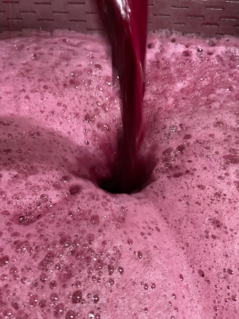Am Anfang ist der Traubensaft noch ganz durchsichtig. Dann wird er langsam rot und ab und zu versuch ich mit dem Schaum ein Lächeln hinzukriegen 😉 und irgendwann ist der Traubensaft dann wunderschön dunkelrot. Damit der Traubensaft etwas mehr Sauerstoff erhält, wird er manchmal nicht direkt von unten nach oben gepumpt sondern über ein Becken nach oben gepumpt. Das sieht man auf dem Bild mit Stefan drauf. Der kümmert sich in dem Moment gerade, dass auch der letzte Tropfen Traubensaft bei mir oben ankommt.