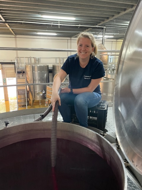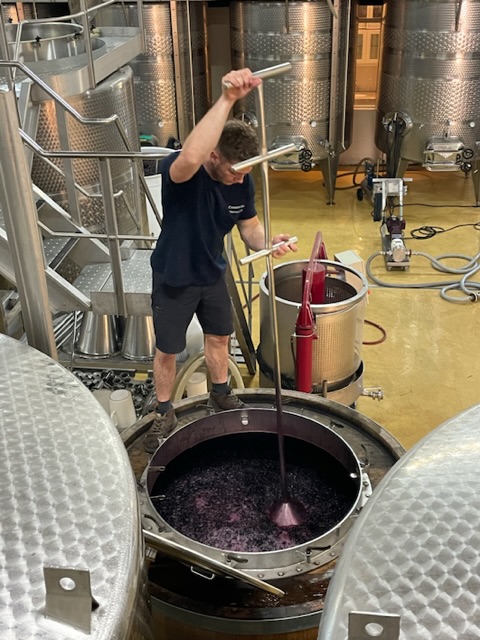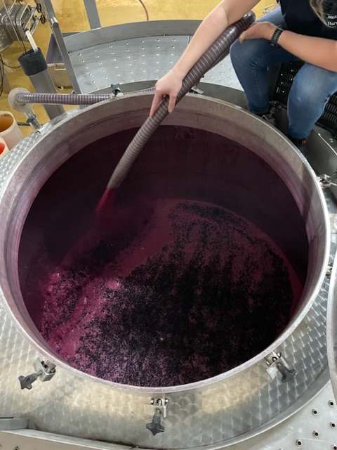 Wenn die Trauben und der Traubensaft mal im Stahltank sind, muss man sich gut um beides kümmern. Die Traubenschalen schwimmen an die Oberfläche und der Traubensaft sinkt, doch was man eigentlich haben möchte ist, dass der Traubensaft alles „Gute“ – sprich Farbe und Tannine – aus den Traubenschalen extrahiert. Der Traubensaft wird also in regelmässigen Abständen darübergepumpt so, dass die Traubenschalen möglichst immer in Kontakt mit dem Traubensaft sind. Aber nicht nur dass, während der Fermentation produziert die Hefe Alkohol, CO2 und Wärme. Das CO2 ist hauptsächlich schuld daran, dass die Traubenschalen nach oben schwimmen, welche dann wiederum die Wärme isolieren. Würden wir nicht regelmässigen den Austausch zwischen dem Traubensaft und den Traubenschalen herstellen, könnte es bis zu 40 Grad warm werden in der Traubenschalenschicht und der Traubensaft – welcher durch die Stahltankmitte gekühlt wird, bliebe bei 24 Grad. Ein solcher Hitzestau würde dazu führen, dass Bitterstoffe aus den Schalen in den Saft gelangen und das wäre dann kein so besonders feines Endresultat. Was wird also möglichst regelmässig gemacht? Richtig, der Traubensaft noch oben gepumpt und über den Traubendeckel gelehrt und die Traubenschalenschicht regelmässig durch sogenannte Punch Downs aufgebrochen damit der Traubensaft immer mal wieder einen anderen Weg durch die Traubenschalenschicht findet.