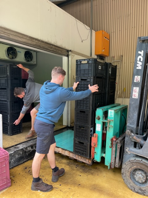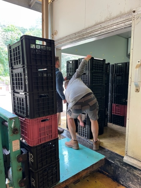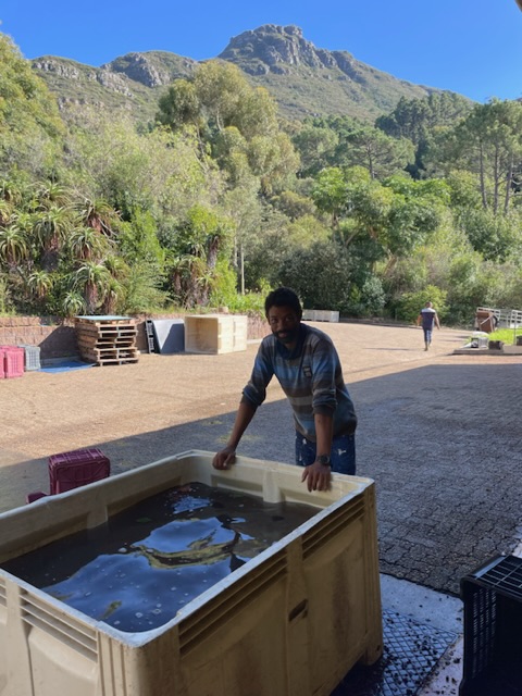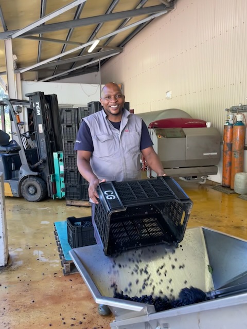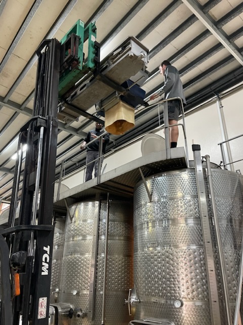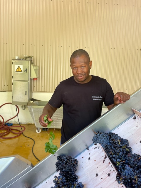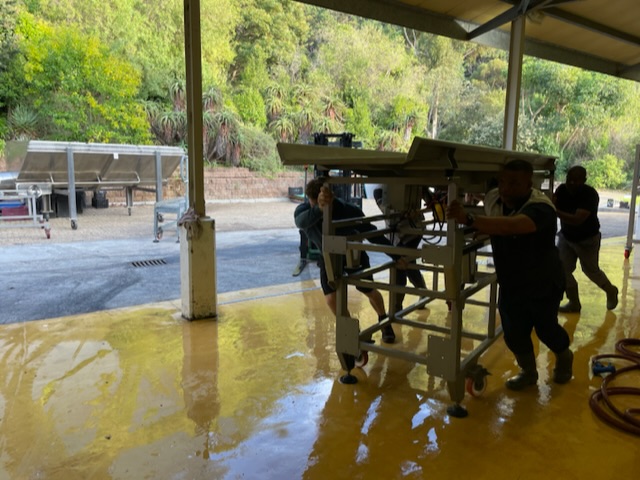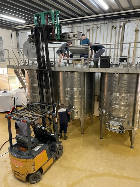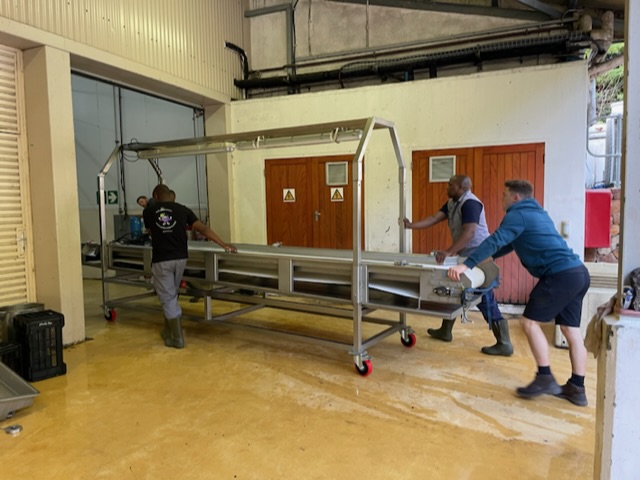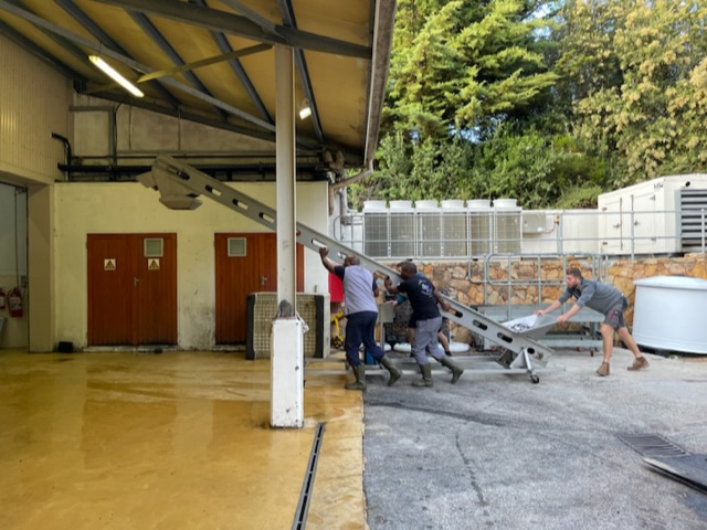 Jeder Winzer hat so seine Methoden und hier bei Constantia Glen, da werden die Rotweintrauben immer von einer ganze Menschenkette bis zum Tank begleitet. Doch damit dies möglich ist, muss erstmal mit vereinten Kräften eine Kette aus Maschinen aufgebaut werden. Siehe Bilder: